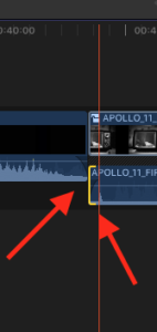Maintenant, vous voyez que la piste "Storyboard" s'est agrandie (la partie noire peu qu'on a du mal parfois à distinguer) et que le son de la partie "APOLLO_11" s'est détachée. Le tour est presque joué. Il suffit de créer un fondu en entrée (référez-vous à la documentation ou venez nous retrouver pendant les cours de montage) et d'allonger la partie audio du clip.